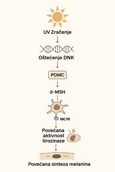 Za početak, UV zraci dovode do oštećenja DNK i samih keratinocita. Kao odgovor na nastalo oštećenje, dolazi do povećane ekspresije gena pro-opiomelanokortina (POMC) koji kodira sintezu i sekreciju melanocit-stimulirajućeg hormona (a-MSH). Vezivanje a-MSH za melanokortin 1 receptor (MC1R) na melanocitima pokreće se signalni put u ćeliji koji je odgovoran za nastanak melanina, i to povećavanjem nivoa tirozinaze i drugih enzima uključenih u biosintezu melanina. Dakle, MSH-MC1R signalizacija dovodi do povećane sinteze pigmenta od strane melanocita i akumulacije melanina od strane epidermalnih keratinocita. Ovim mehanizmom, koža postaje zaštićena od UV zračenja. Za one koji bolje pamte vizuelno, kako ovaj proces shematski izgleda, pogledajte ispod.